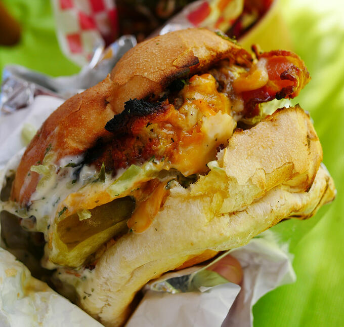 I couldn’t ignore the hunger pangs once they started. So when tantalizing smells wafted in my direction, I let them draw me down the boardwalk toward Cheerful Harlies Fri Truck.