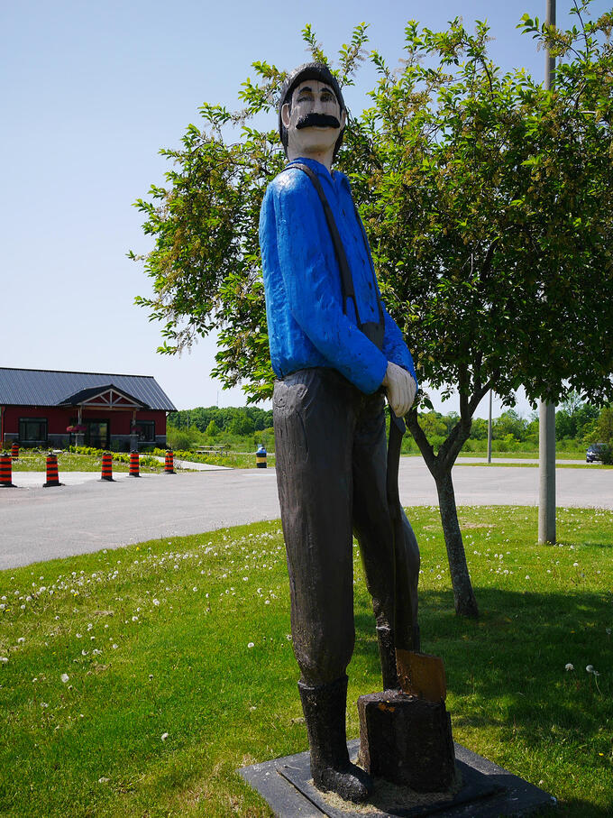 I went into Renfrew, searching for a Lumberjack statue supposedly near Town Hall, but I couldn’t spot him. So I headed to the Renfrew Visitor Information Center to see the Caboose; it was under repair. A lumberjack was on this property; as it turns out, this was the guy I was looking for.