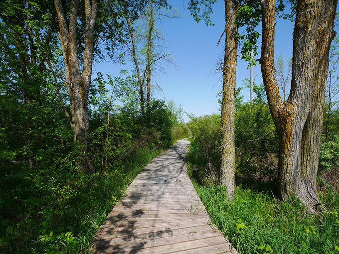 Cross the boardwalk and walk around Cobden Marsh on raised gravel-topped berms, keeping the trails high and dry. The route circles the marsh, a provincially significant wetland with plenty of opportunities to observe wildlife in its natural habitat. I didn’t explore the entire trail, but I’d guess the Cobden Marsh Interpretive Trail is no longer than 1.5 km if the loop is still intact. At least if you come to a dead end, walking back around the wetland will be a flat-out breeze.